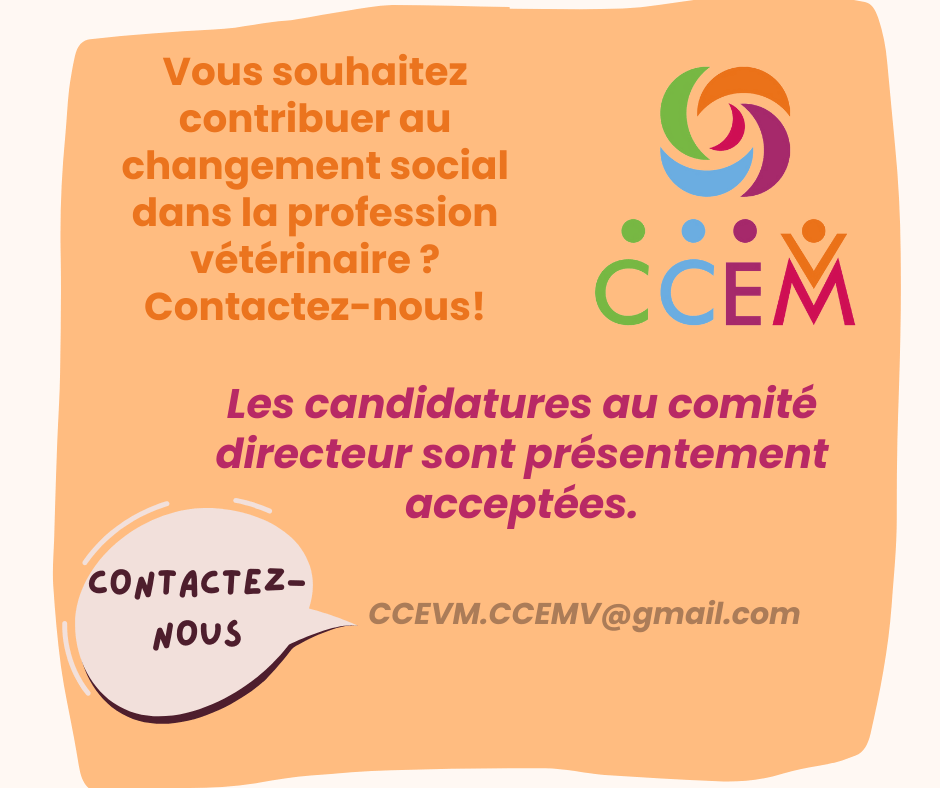 Vous voulez contribuer au changement social dans la profession vétérinaire ? La Collective Canadienne pour l’Équité en Médecine Vétérinaire/ Canadian Collective for Equity in Veterinary Medicine/ (CCEMV/CCEVM) recrute actuellement des bénévoles pour notre comité directeur. Nous recherchons des étudiant.e.s vétérinaires, vétérinaires et autres professionnel.le.s vétérinaires qui s’identifient à un ou plusieurs groupes en quête d’équité. Nous recrutons pour une variété de postes. Veuillez nous envoyer un courriel à CCEVM.CCEMV@gmail.com si vous souhaitez en savoir plus !