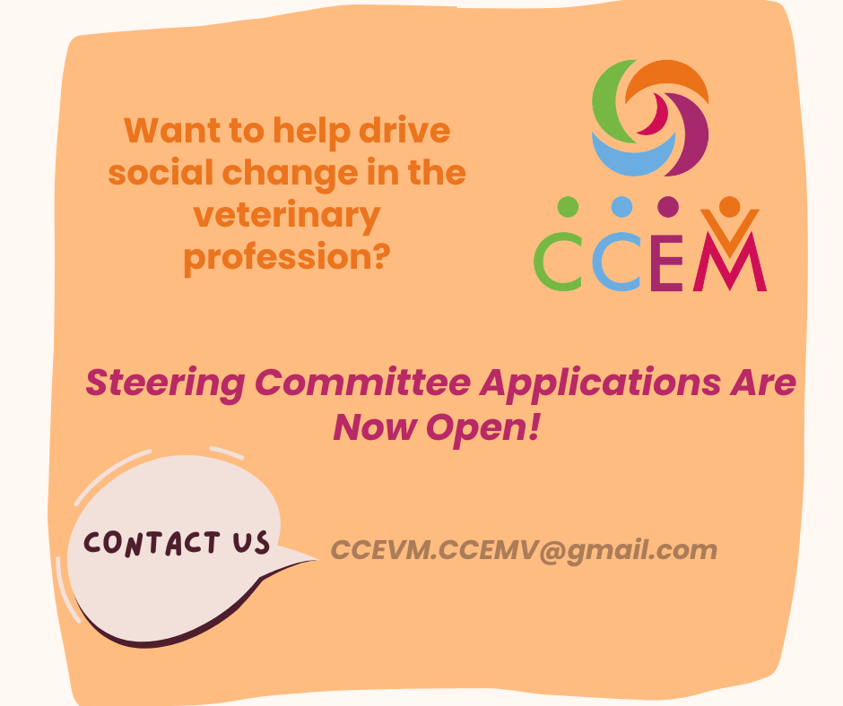 Want to help drive social change in the veterinary profession? The Canadian Collective for Equity in Veterinary Medicine/ Collective Canadienne pour l’Équité en Médecine Vétérinaire (CCEVM/CCEMV) is currently recruiting volunteer leaders for our Steering Committee. We are looking for veterinary students, veterinarians, and other veterinary professionals who identify with one or more equity-seeking groups. We are recruiting for a variety of positions. Please email us at CCEVM.CCEMV@gmail.com if you are interested in learning more!